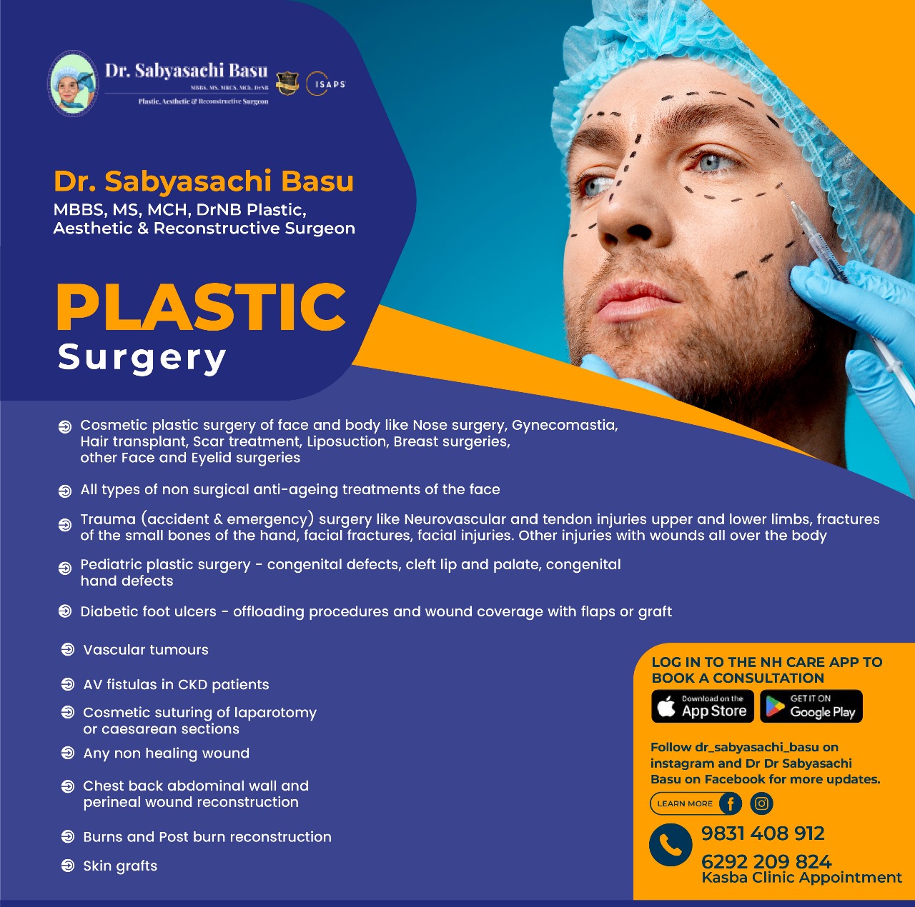 Dr Sabyasachi Basu is a consultant Plastic, Aesthetic and Reconstructive Surgeon at Narayana Health-Rabindranath Tagore Hospital.He is mostly interested in Aesthetic Surgeries like Rhinoplasty, Gynaecomastia, Body Contouring, Liposuction, Tummy tuck, Mommy makeover, Facelift, Blepharoplasty, Breast augmentation, reduction and breastlift surgeries. He is also interested in nonsurgical facial aesthetic procedures and of course, Hair Transplantation. He is also trained in Oncoplastic, Oncoreconstruction and Cleft surgeries. He also operates on burns, trauma, and diabetic foot patients. Dr. Sabyasachi Basu is the top plastic surgeon in Kolkata, renowned for his excellence in cosmetic, reconstructive, and aesthetic surgery at Narayana Health. With years of specialized experience, Dr. Basu combines advanced surgical techniques with personalized care to ensure safe and natural-looking results. Recognized as the top plastic surgeon in Kolkata, he focuses on patient satisfaction, precision, and long-term well-being. Whether you’re considering aesthetic enhancement or reconstructive surgery, Dr. Basu offers world-class medical expertise and compassionate guidance every step of the way.